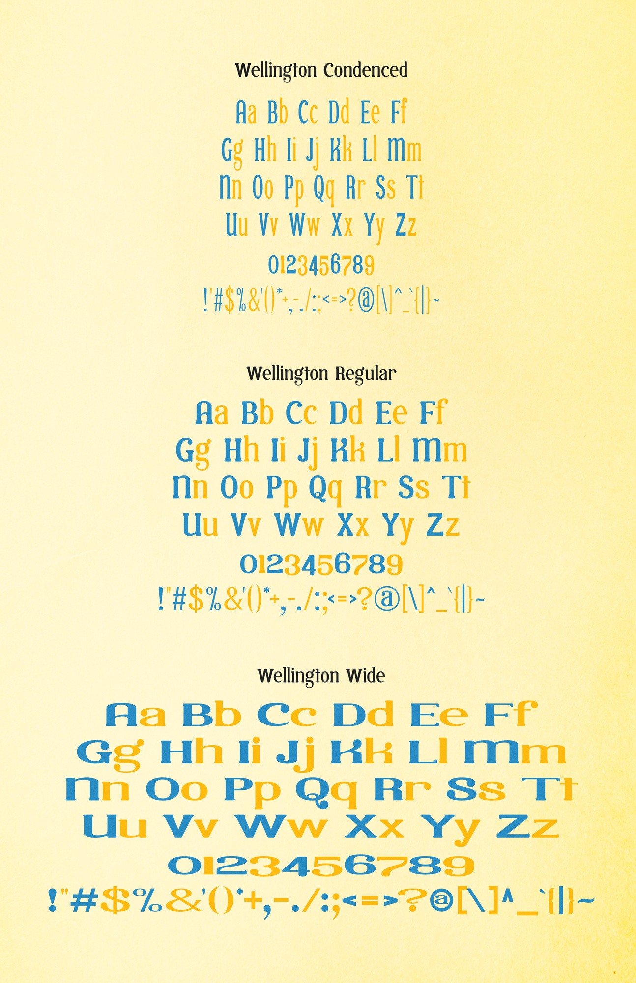 Display typeface with 3 weights: condensed, regular, wide and also has numbers and punctuations.